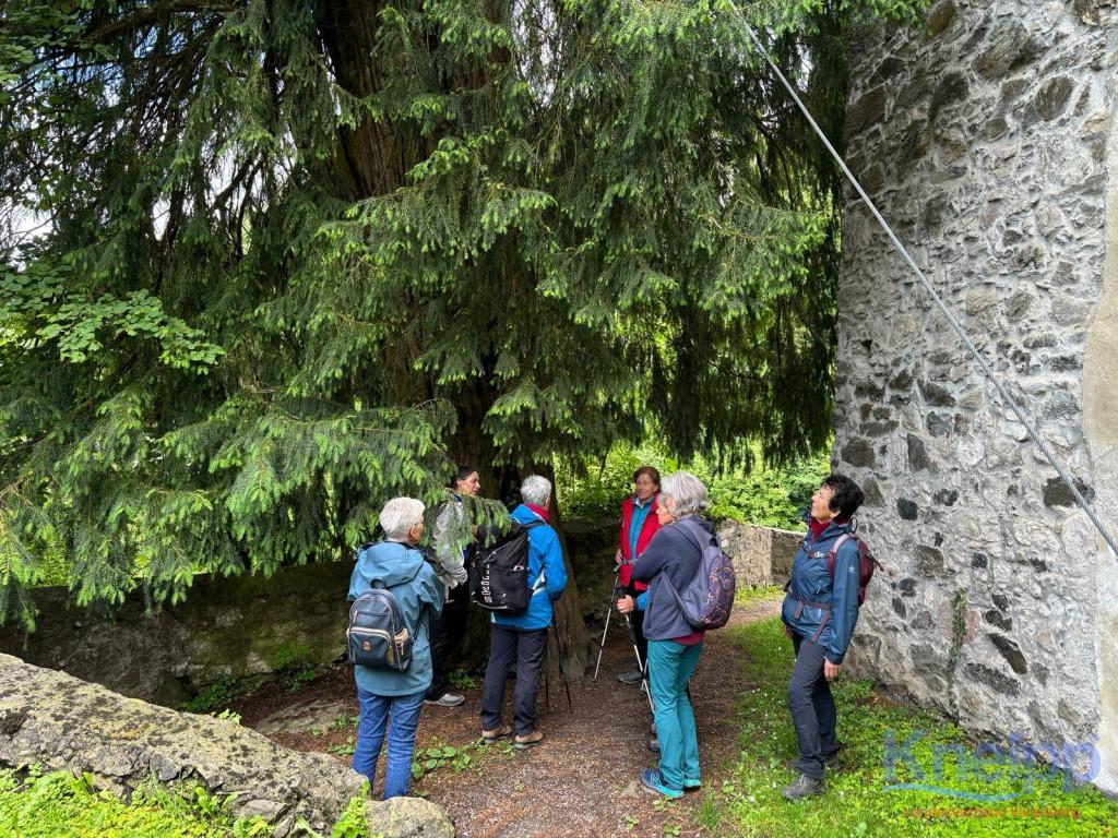 Schließlich überschreiten wir die Grenze von Lichtenstein nach Österreich und erreichen bald die beliebte Wallfahrtskirche St. Corneli aus dem 11. Jahrhundert. An der Mauer des Kirchleins steht ein Naturdenkmal, das mit Sicherheit schon viele Besucher beeindruckt hat: Der älteste Baum in Vorarlberg, die 1000jährigen Eibe.