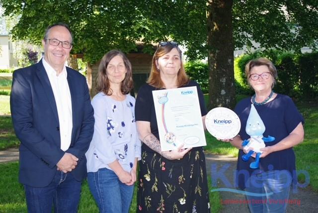 Im Rahmen einer Feier zum Muttertag und der Wieder-Zertifizierung unter Anwesenheit des Rankweiler Vizebürgermeisters konnte ich am 14. Mai 2024 im Namen des Österreichischen Kneippbundes die neue Zertifizierungsurkunde an das Team des Kindergartens Montfort in Rankweil unter der Leitung von Frau Monika Müller überreichen.