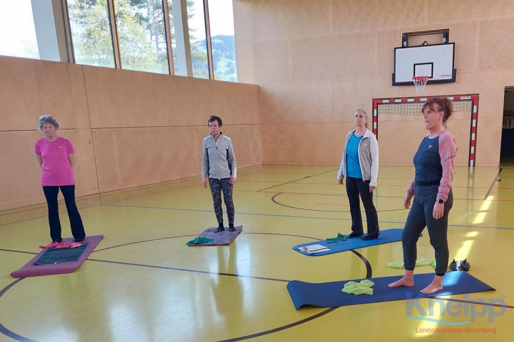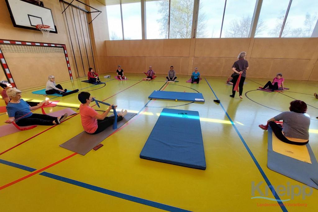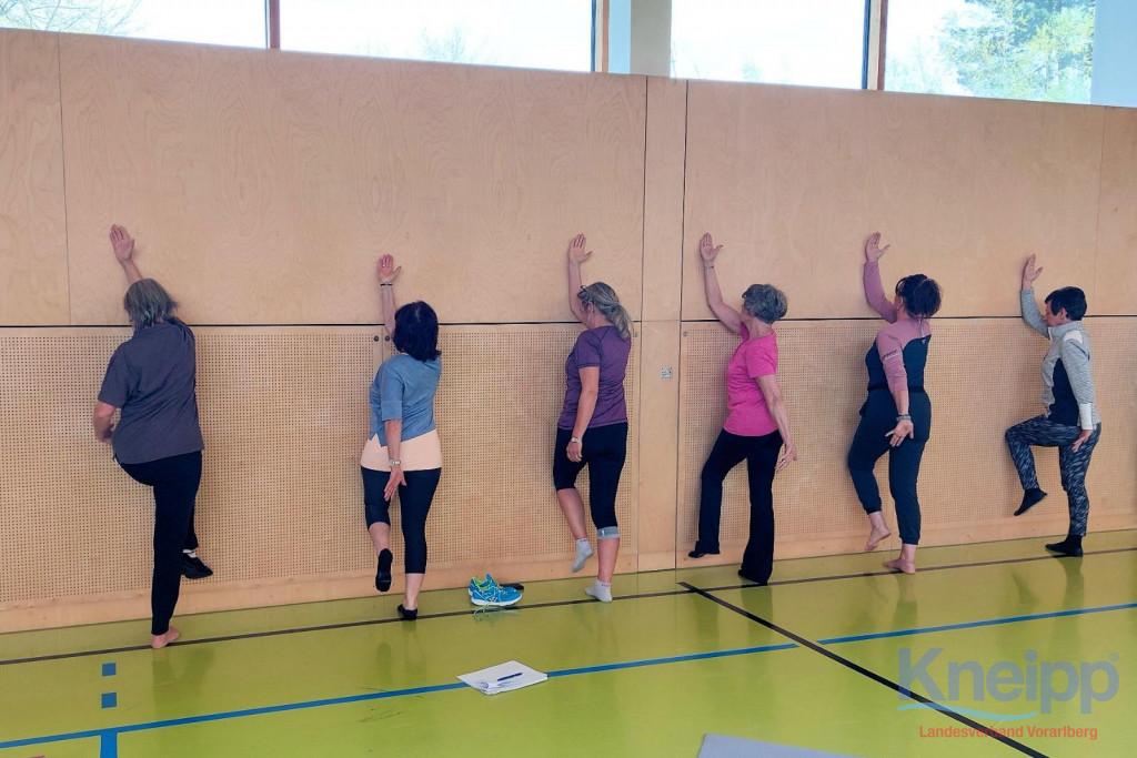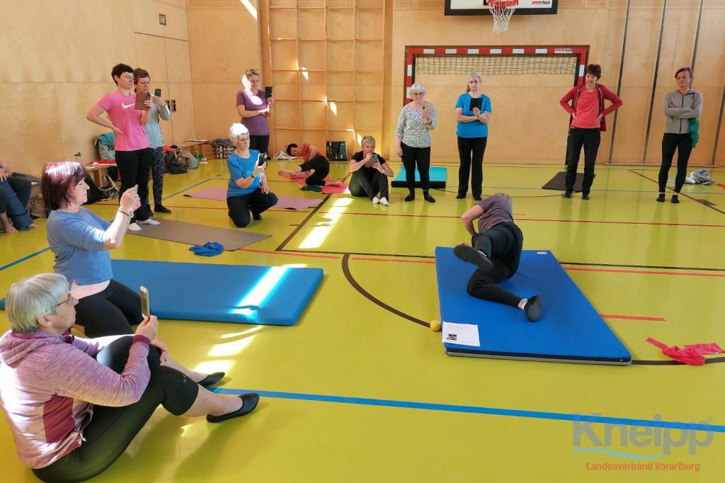 Das physiologische Gangmuster und konzentrische (überwindendes) und exzentrisches (nachgebendes) Muskeltraining mit dem Theraband haben die 15 Teilnehmerinnen in der Praxis umgesetzt.